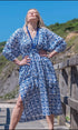 A suitcase essential for the stylish woman. A bright and billowy kaftan in soft cotton. A neat V neck has gathers all around. A raglan sleeve finishes into a buttoned cuff. There are deep side slits from the hem. This gorgeous kaftan comes with a printed sash belt to tie up around the waist.
