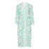 There are two deep pockets and waist-tie printed in a contrast print stripe. Wrist length sleeves. Elegant midi length. Loose fit.