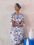 A gentle, abstract floral in NoLoGo-Chic's best selling, flattering shape to wear all summer long. Shades of denim blue and summer reds. As ever, the fabric is a mid-weight linen with our special soft wash handle. The sleeves have a deep double cuff and the hem has our signature deep double border to weigh the dress whilst wearing. A narrow row of seashell real pearl buttons open from a neat V-neck. There are pockets flatteringly set in from the sides .