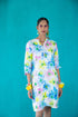 A gorgeous print inspired by Venetian glass. A classic NoLoGo-Chic floral in our best selling, flattering shape to wear all summer long. As ever, the fabric is a mid-weight linen with our special soft wash handle. The sleeves have a deep double cuff and the hem has our signature deep double border to weigh the dress whilst wearing. A narrow row of seashell real pearl buttons open from a neat V-neck. There are pockets flatteringly set in from the sides .